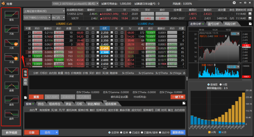 咏春---期权分析师软件,支持图表、分析、交易等功能板块,为使用者提供专业期权波动率走势分析、盈亏概率分析、期权希腊值、持仓监控等实用功能,