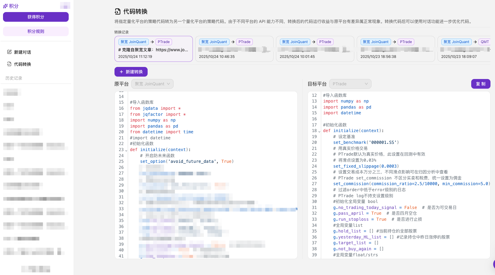 分享一个在线网站,小白也能使用,可以将聚宽的代码一键转换为 PTrade 代码。
