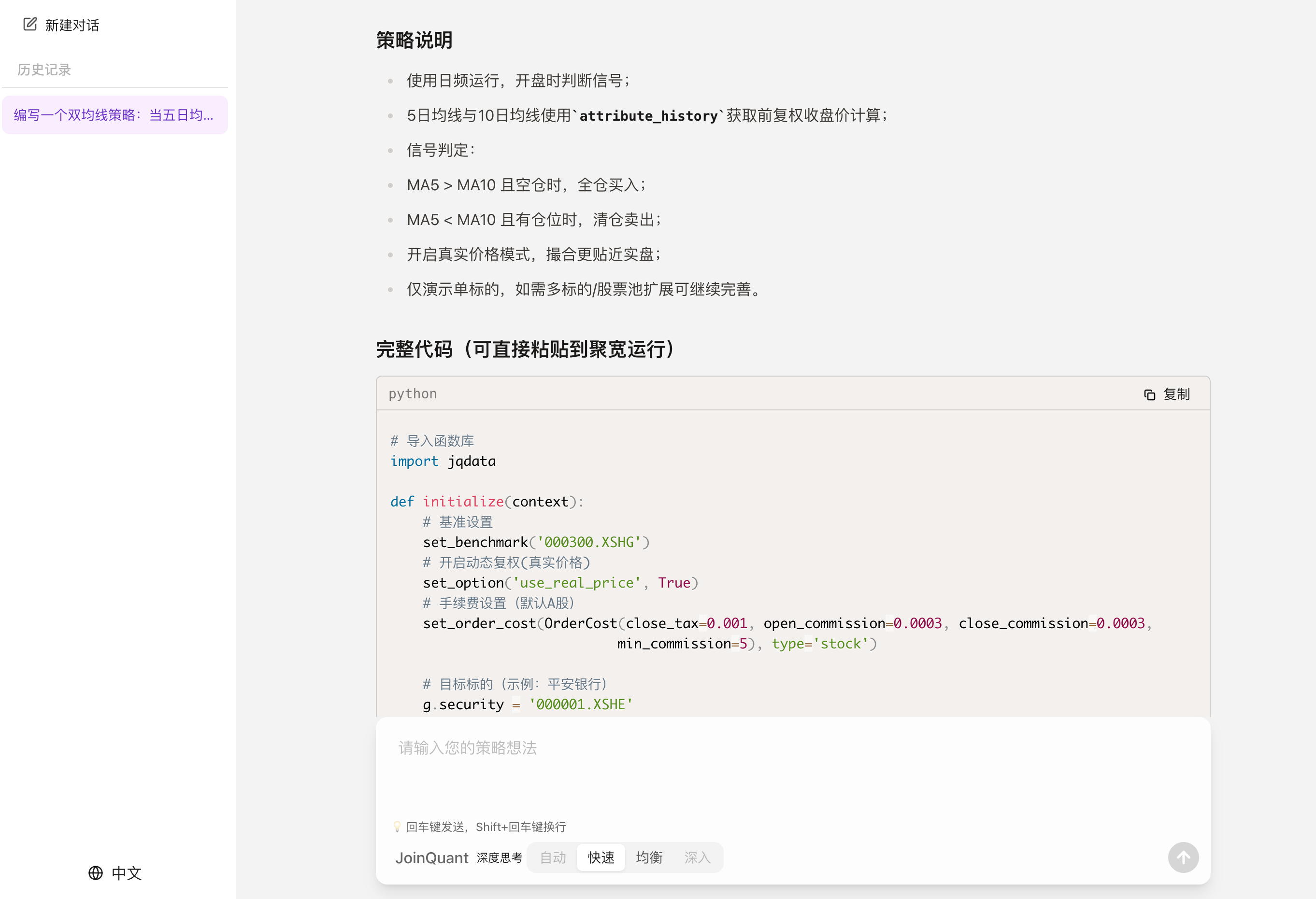 不会代码的进,AI编写量化策略代码工具经验分享 Thom516 这家伙很懒,还没有设置简介 0 人点赞了该文章 · 183 浏览 亲测最好用的AI编写量化策略工具,可以让 AI 直接生成各平台(包括PTrade,迅投QMT,聚宽Joinquant,掘金MyQuant,同花顺Supermind等等)上可运行的策略代码,代码质量远高于直接使用 DeepSeek、GPT等平台。AI工具入口:https://iris.findtruman.io/ai/tool/ai-quantitative-trading/大家可以直接向AI描述策略,然后一键生成可运行的完整策略代码,也可以把它当做一个API 查询工具。