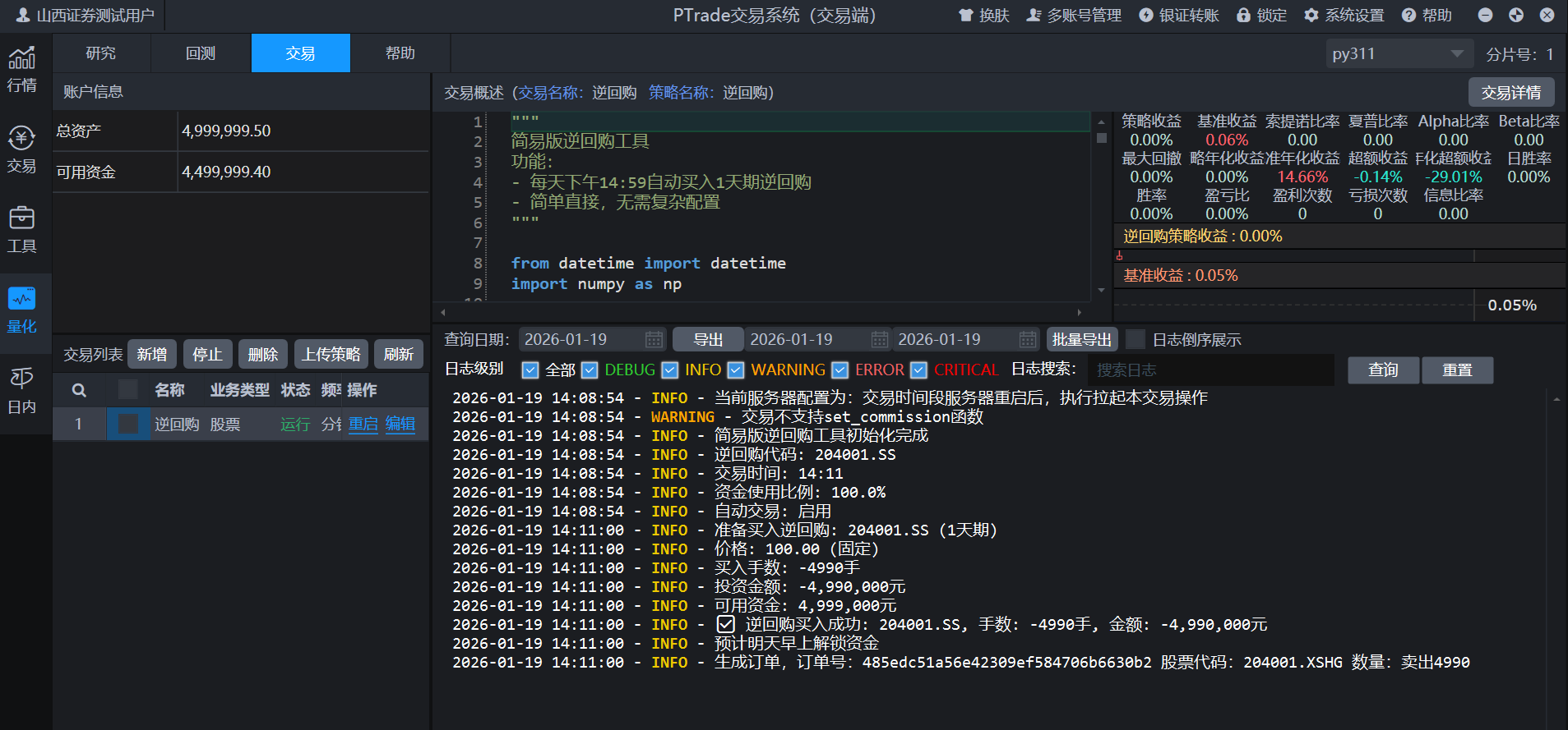 这个自动逆回购策略是一个“小而美”的资金管理工具,特别适合: - 希望自动化理财的投资者 - 股票账户常有闲置资金的用户 - 对资金安全性要求较高的保守型投资者