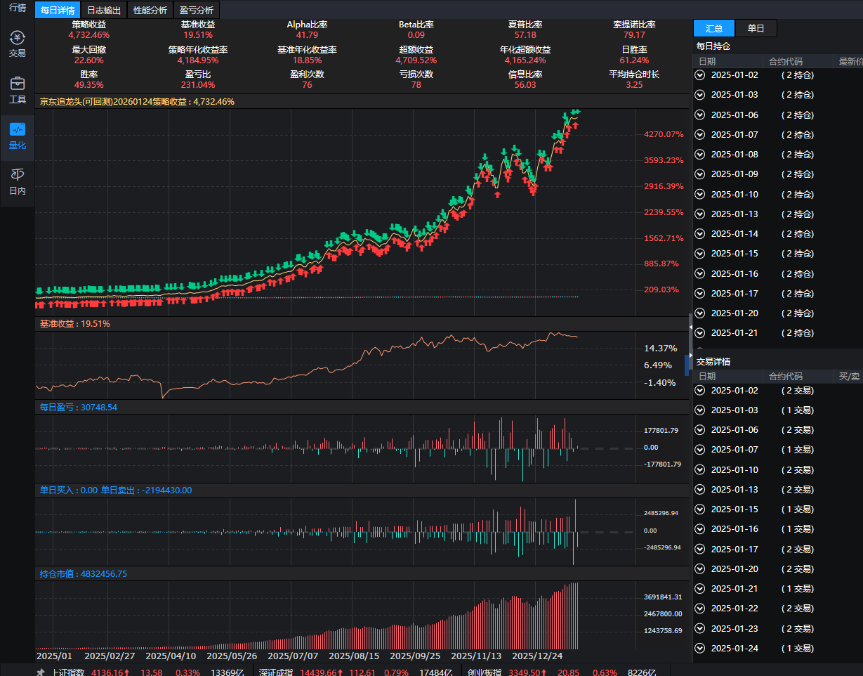 做为小散户要想把资金快速做大,唯一途径就是打涨停,打涨停方法有很多,市场很流行龙头战法,这也叫数板战法,这也是高位接盘战法,这类上涨过程分时图比较极端,上涨过程你往往抱不住,下跌时往往A杀一字跌停你根本卖不掉,本代码买点前置,让别人来给自己接力。如果想购买策略做为你投资的参考, 请 从京东APP或者京东官网搜索:证券自动量化交易程序小店,购买前先咨询一下客服,别买错,非诚勿扰 。 非诚勿扰。注意:1.本代码仅供学习参考使用,风险自担。2.代码买以后是终身可以免费使用,系统升级免费售后升级。3.下面图片为2025年以来的回测收益,仅供参考。